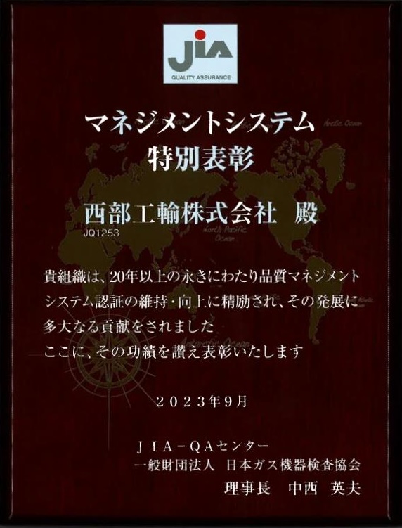 JIA-QAセンター 一般財団法人 日本ガス機器検査協会より、品質マネジメントシステム、環境マネジメントシステム及び労働安全衛生マネジメントシステム認証で表彰されました。