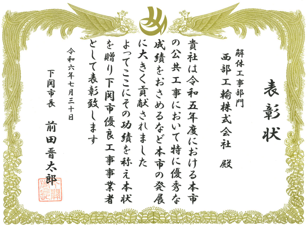 令和6年7月からの豪雨による災害対応において、厳しい作業環境のなか迅速に対応され地域住民の安全・安心な生活の確保に大きく貢献されました よってここに深く感謝の意を表します