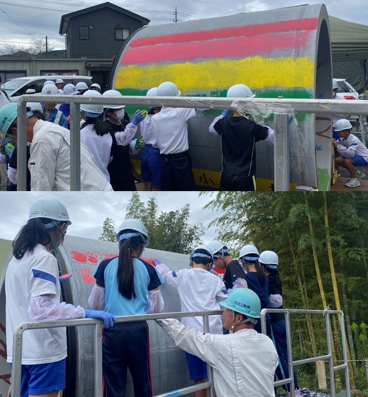 「木屋川工業用上水道二条化工事(コプロス、西部工輸、ショウエイ JV)」で下関市立豊東小学校の6年生が記念として、巨大水道管に絵を描いて手形を押すペタペタアートを楽しみました。この巨大水道管は豊東小学校の運動場や体育館の下を通る予定です。
